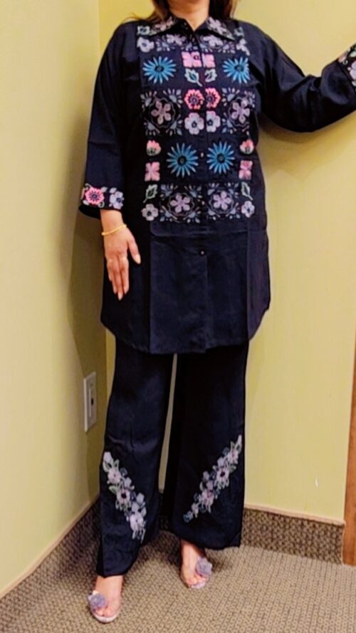 Blooming roses with lighly bell sleeves- deep red 2 piece coord set with white fluffy embroidery on shirt and bottom