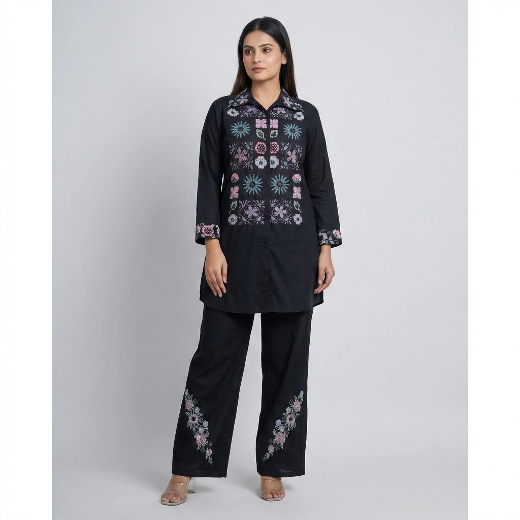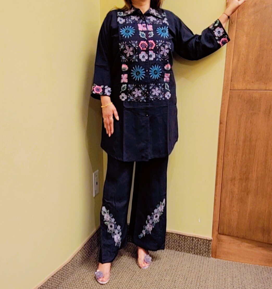Black Multi-thread Embroidered Roman Silk fabric Coordset