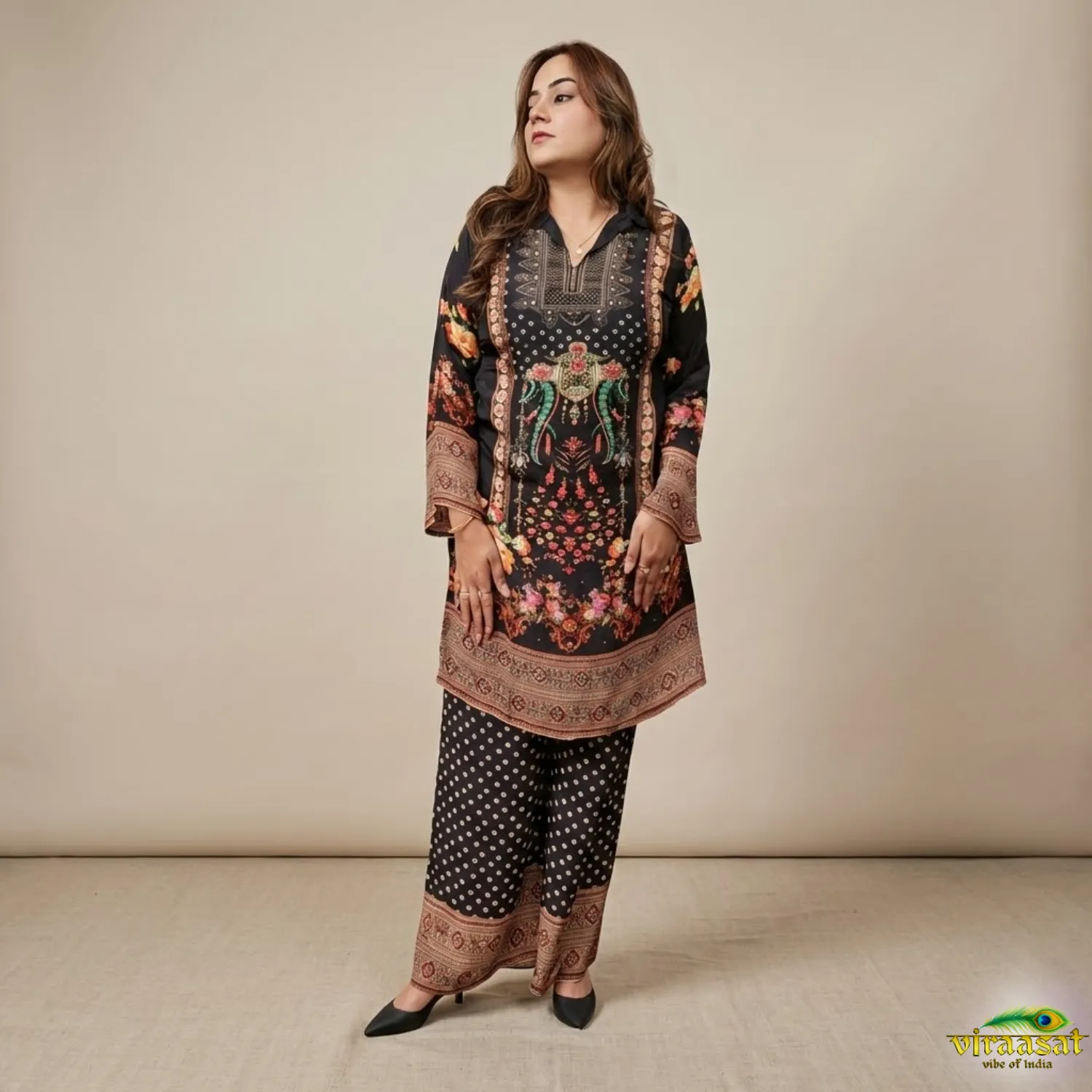 Made from high-grade Turkish crepe material, this cord set offers durability, a lightweight feel, and an impeccable drape. The fabric is breathable and smooth against the skin, making it ideal for extended wear. Its rich black color brings versatility to your wardrobe, allowing you to pair the set with an array of accessories to suit your personal style. Designed with precision, the set also features tailored cuts that create a flattering silhouette, complementing diverse body types effortlessly.
