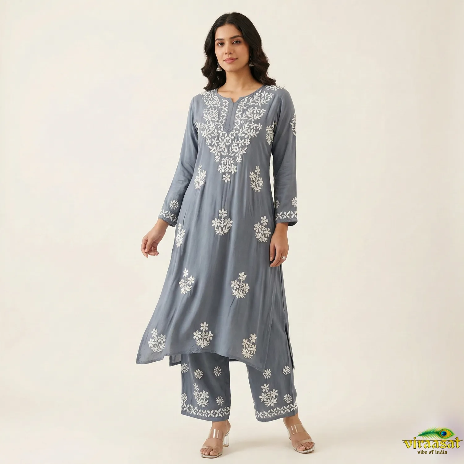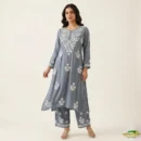 Lucknavi chickenkari kurti sets with white embroidery- kurti and plazo ( 2 piece) size 44 price $40 Fabric rayon Color – grey
